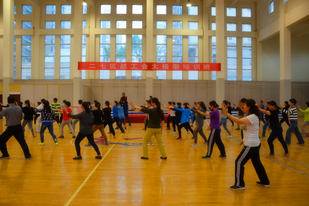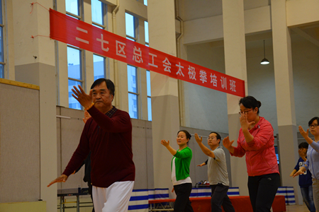 5月9日下午6点半,二七区总工会太极拳培训班在政通路小学室内篮球场正式开班。