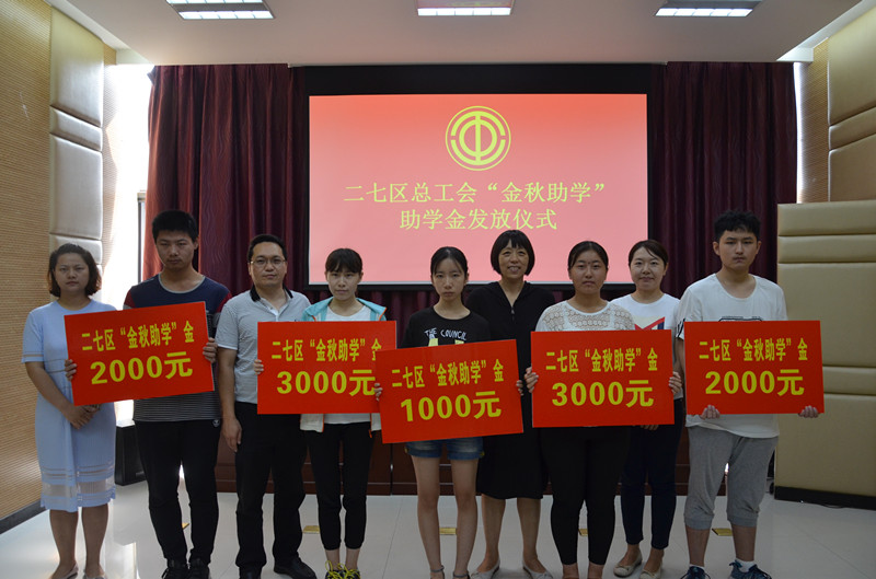 为帮助贫困学子顺利进入大学的学业,8月22日上午,二七区总工会在区帮扶中心会议室举行2017年度“金秋助学”助学金发放仪式,为我辖区5名困难职工家庭学子发放了助学资金共计1.1万元。区总工会领导班子及相关基层工会主席参加了活动。仪式由区总工会党组副书记臧刘伟主持,区总工会主席张新云出席仪式并讲话。