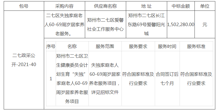 2、采购项目名称:郑州市二七区卫生健康委员会计划生育“失独”家庭老人60-69周岁居家养老服务项目