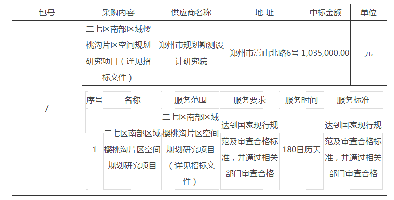 2、招标范围:二七区南部区域樱桃沟片区空间规划研究项目(详见招标文件);