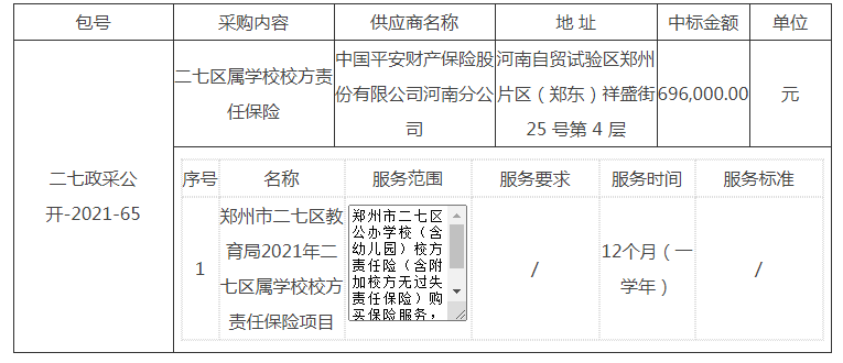 1.采购范围:郑州市二七区公办学校(含幼儿园)校方责任险(含附加校方无过失责任保险)购买保险服务,具体内容详见采购文件。