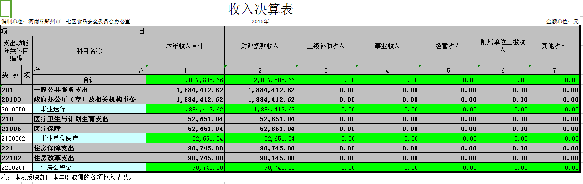 2015年郑州市二七区食品安全委员会办公室收入决算表
