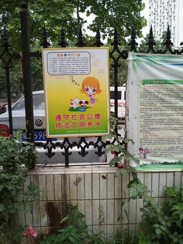 活动中,社区工作人员深入居民楼院,在小区醒目位置悬挂“文明养犬八倡议”宣传展板,展板以生动活泼的动画形式,倡导居民主动为爱犬注射疫苗、办理养犬证,外出溜犬要栓狗链并及时清理粪便,遵守社会公德,依法文明养犬。