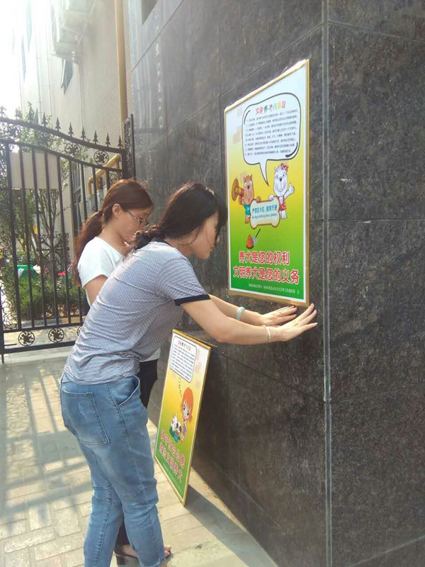 随着小区养狗家庭的增加,“养狗扰民”的投诉也随之增多。小宠物们在居民楼道、小区绿化带等处随地大小便,不仅严重污染环境卫生,更带来不少邻里纠纷。为了化解这一矛盾,提高社区内养宠物家庭的养狗素质。宏鑫花园社区开展文明养犬宣传活动,在小区内挂文明养狗宣传牌,促使养狗人士自律,并让居民互相监督,实现文明养狗。在遛犬集中区,包括社区宣传栏、公园、居民楼门院等明显部位张贴宣传图和温馨提示,倡导大家文明养犬。