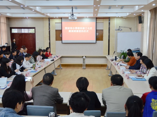 10月9日下午,二七区教体局与登封市教体局教育合作项目签约仪式在汝河路小学举行。此次合作中,登封市教体局将先后委派70余名小学校长到二七区学校进行跟岗研修,与二七区校长共同研修学习提升。登封市教体局党委书记、局长杨飞剑,工会主席李嫩霞,二七区教体局党委书记、局长刘子科,副局长孙岩梅,登封市第一批跟岗研修校长团全体成员,二七区属参培学校校长以及局进修学校相关同志参加了签约仪式。签约仪式由孙岩梅副局长主持。
