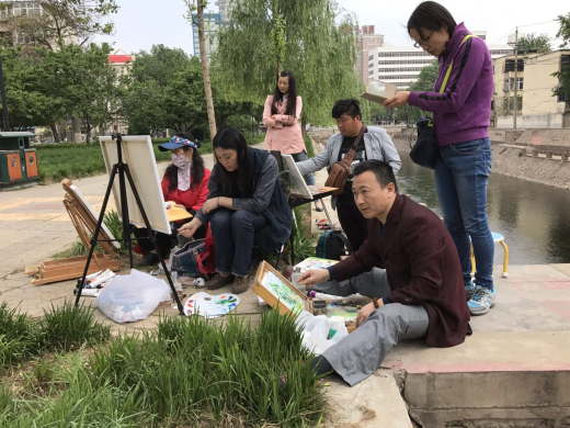 4月26日上午,教研员王莹莹老师与106中学王清华老师带领中小学美术教师在郑大金水河边进行油画写生教研活动。