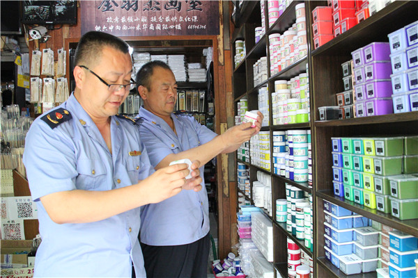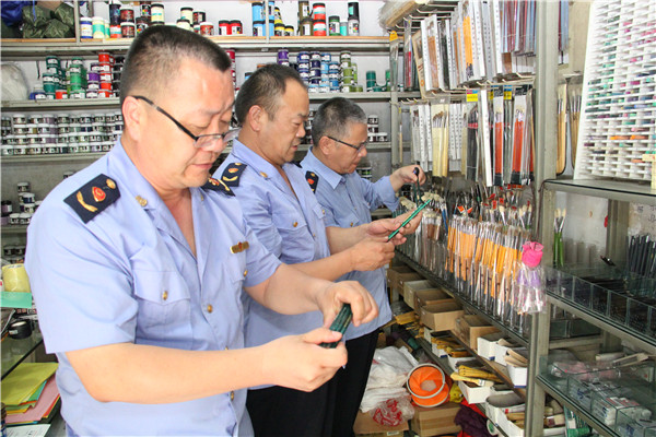 6月1日下午,工商执法人员在交通路上的文具店、世纪联华超市和106中学周边店进行突击检查。此次检查主要查看是否有营业执照,产品进货渠道是否正规,是否存在假冒伪劣和商标侵权现象。在检查过程中,凡发现有“三无”产品当即责令老板将商品撤柜封存,并限期整改。此外,工商执法人员以购买的形式还随机提取样品进行抽检。目前,已检查了6家文具店,提取中性水笔笔芯、2B铅笔、橡皮等20个批次的样品进行检测。