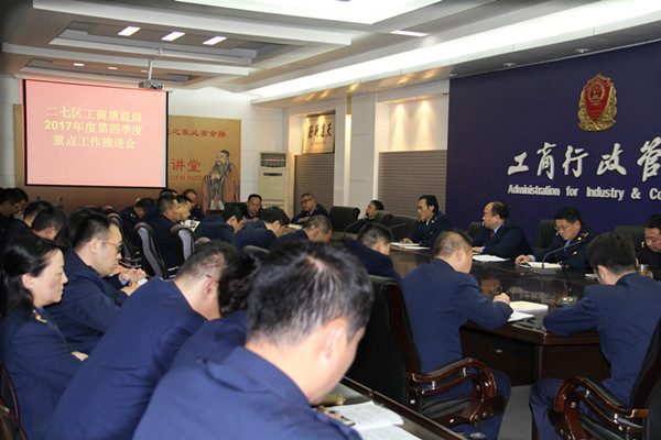 10月11日下午,二七区工商质监局召开2017年第四季度重点工作推进会,认真传达贯彻市局和二七区近期重要文件和重要会议精神,对做好第四季度重点工作进行再部署、再强调、再推进。
