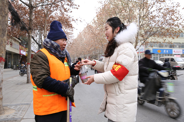 早上7:30左右,志愿服务队的教师们已准备就绪,抵达派粥点。随着孩子们陆续入园,实验幼儿园大门口的行人也越来越多,来取粥的有我们熟悉的教师、家长,也有从未谋面的行人,爱心派粥点逐渐热闹起来,寒风参半着清香,节日弥漫着幸福,一杯杯爱心腊八粥,方便着行人,温暖着人心!为了让忙碌中的每一个劳动者都能享受到这份温暖,志愿服务队的教师们特地来到街口,将腊八粥送到环卫工人、交警、停车管理员的手中。