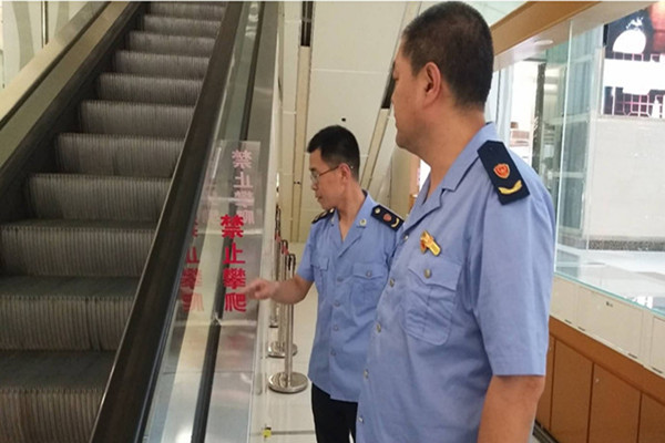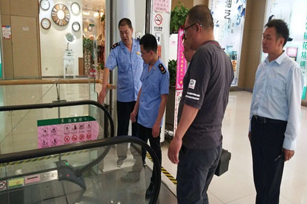 为切实做好我辖区大型商场特种设备安全监管工作,近日,二七区工商质监局建中街所组织执法人员对辖区内陈寨花卉市场大学路店使用的扶梯进行了安全监督检查,执法人员实地查看了扶梯扶手带上下端站的防攀爬装置、防坠落装置、电梯安全使用注意事项张贴等情况,最后执法人员对电梯使用单位存在的问题一一指出并提出整改意见,责令他们立即整改,消除安全隐患,确保人民群众生命财产安全。