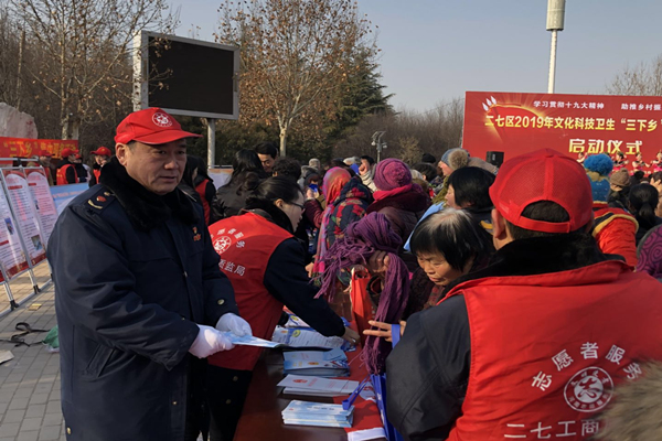 1月16日上午,二七区2019年文化科技卫生“三下乡”活动在马寨镇康师傅公园举办启动仪式。二七工商质监局作为“三下乡”活动法律成员单位积极参与,马寨所党员志愿者配合局人事科为马寨镇村民群众提供法律咨询服务,向群众讲解打击传销有关知识,提高群众对传销的识别、防范能力,宣传消费者维权相关法律法规,增强群众消费维权意识。现场接受咨询10余人次,发放宣传资料120余份,受到村民群众的一致好评。