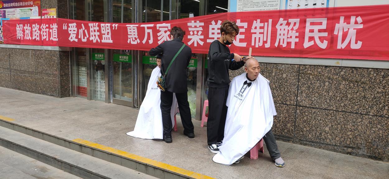 10月27日,解放路办事处联合辖区爱心企业AS Hrir Salon在民主路社区汇港新城小区开展义剪活动。天气虽然有少许凉意,但社区居民参加活动的热情却很高涨。