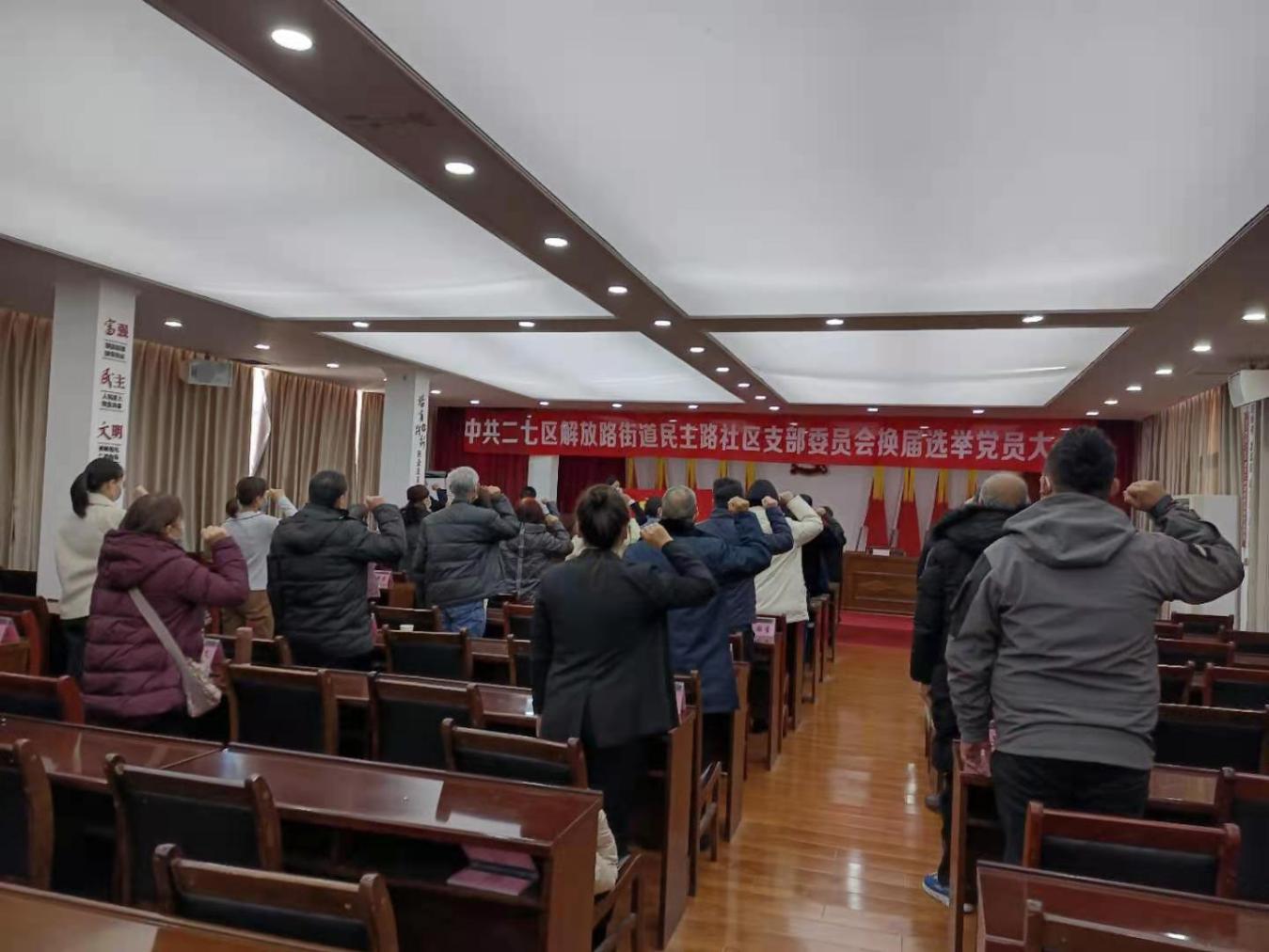 12月24日上午,解放路街道民主路社区支部委员会换届选举党员大会在庄严的国歌声中拉开序幕。大会严格按照换届程序,传达社区“两委”换届选举的纪律要求,明确了今后工作的总体要求和主要任务。