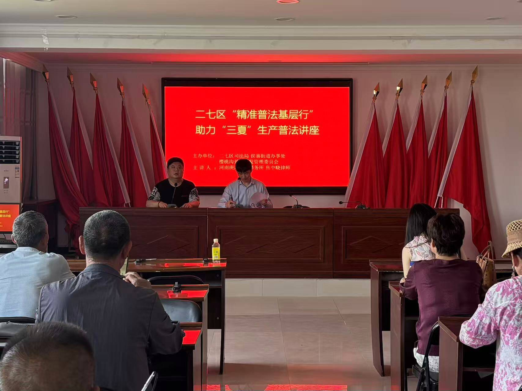 为助力“三夏”生产,提高社区居民法律意识,6月6日,郑州市二七区司法局、樱桃沟司法所、侯寨司法所邀请河南庚戌律师事务所焦中晓律师在樱桃沟管委会大路西社区举办了一场别开生面的普法讲座。此次讲座吸引了社区居民、“法律明白人”以及调解员等众多人员参与,现场气氛热烈。